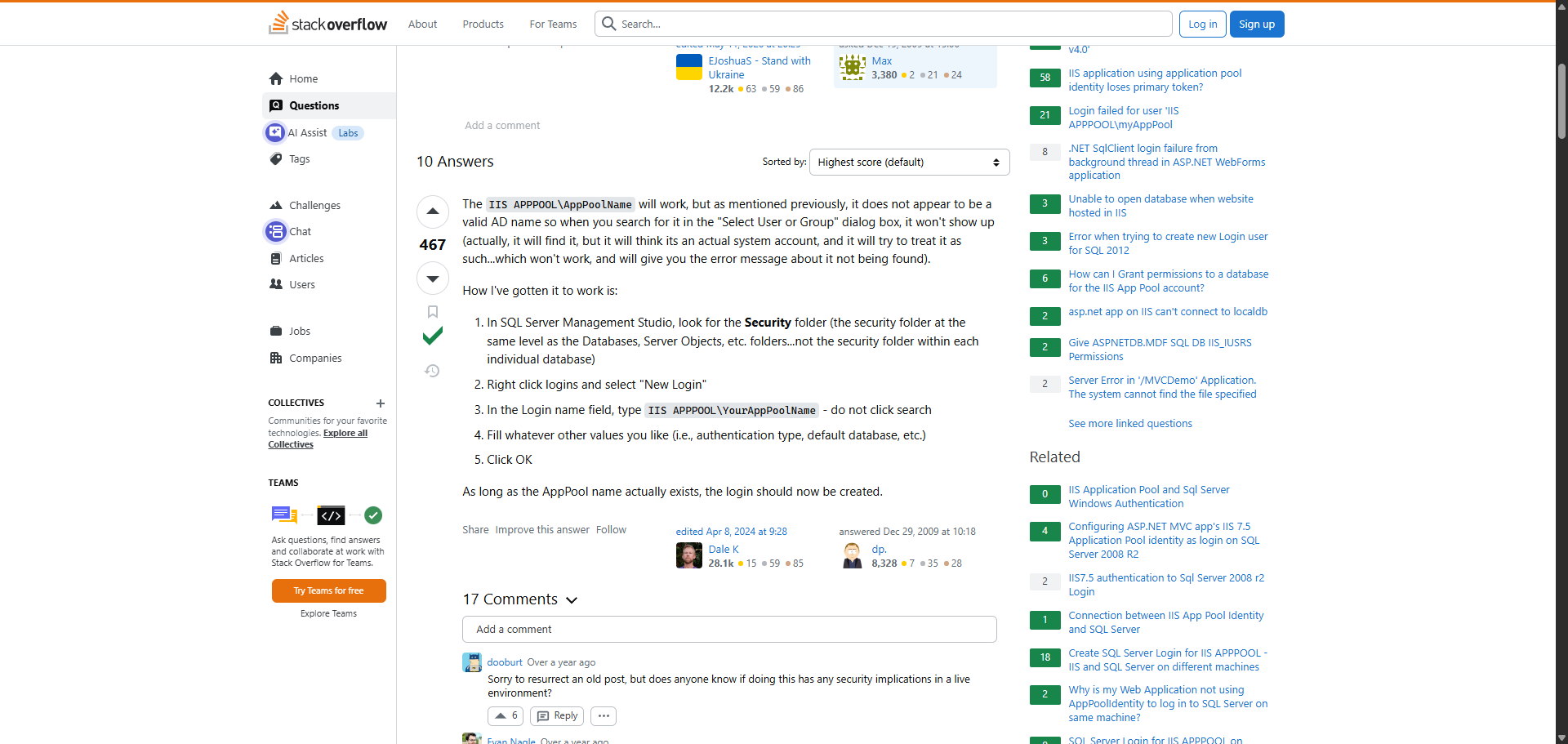 IIS APPPOOL\YourAppPoolName- do not click search - Fill whatever other values you like (i.e., authentication type, default database, etc.)